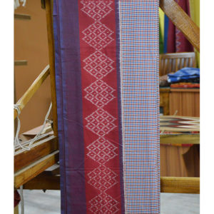 Cotton Ikat saree, red and blue small checked saree with plain voilet border. The saree is a unique piece accentuated by ikat motifs along the border and on the pallu.
