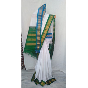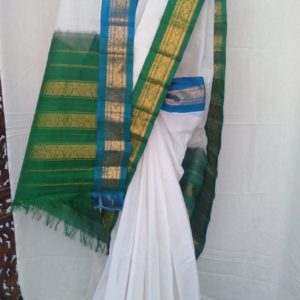 Off-white  cotton body with pure silk blue and green ganga jamuna  borders with zari and pallu