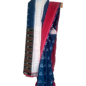 Return To ShopBlue and white ikat motifs body with red solid borders with ikat pallu and Red blouse