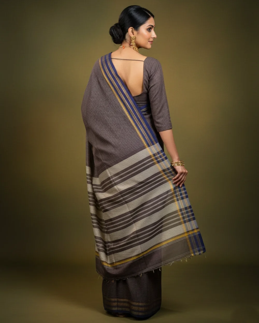 This saree features a soft brown base with a navy blue and mustard border. The pallu incorporates stripes in brown, cream, and yellow shades, adding classiness to it. It comes with no blouse piece, it gives the elegant, simple look.