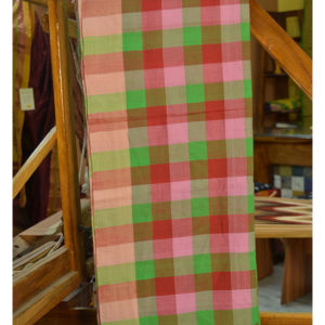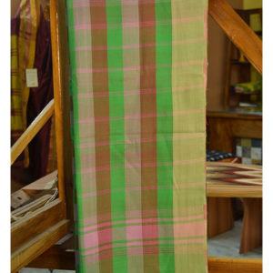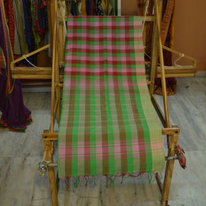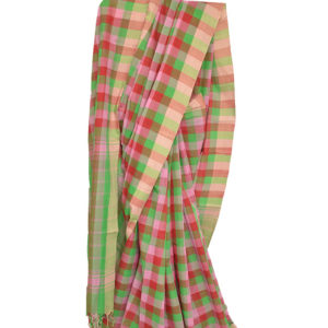 The saree is woven in multi-colour warp (yarns along the border) of green, pink and red colours with beige colour for border, which makes the border look lighter than the colours in the body. The checked pattern of the saree is achieved by weaving with multi-colour weft (yarns across the border) of the same colours.