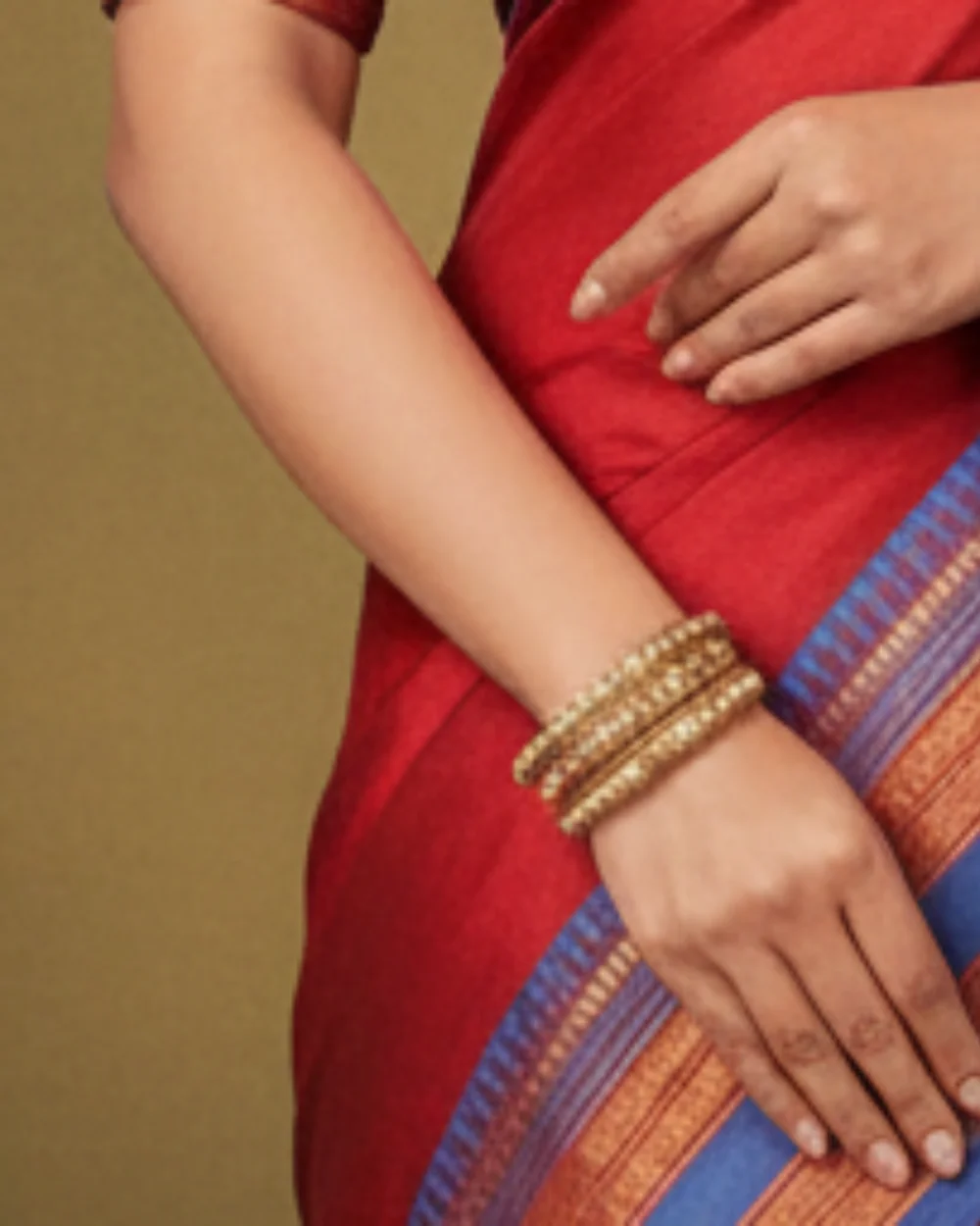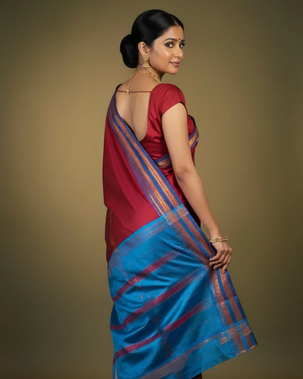 This is a stunning Deep Red saree. The matching Deep Red blouse has elegant contrasting border accents on the sleeves. The pallu and border are vibrant Sky Blue, decorated with striking gold-toned stripes. It forms a complete, festive look defined by the bold Red and Blue color contrast.