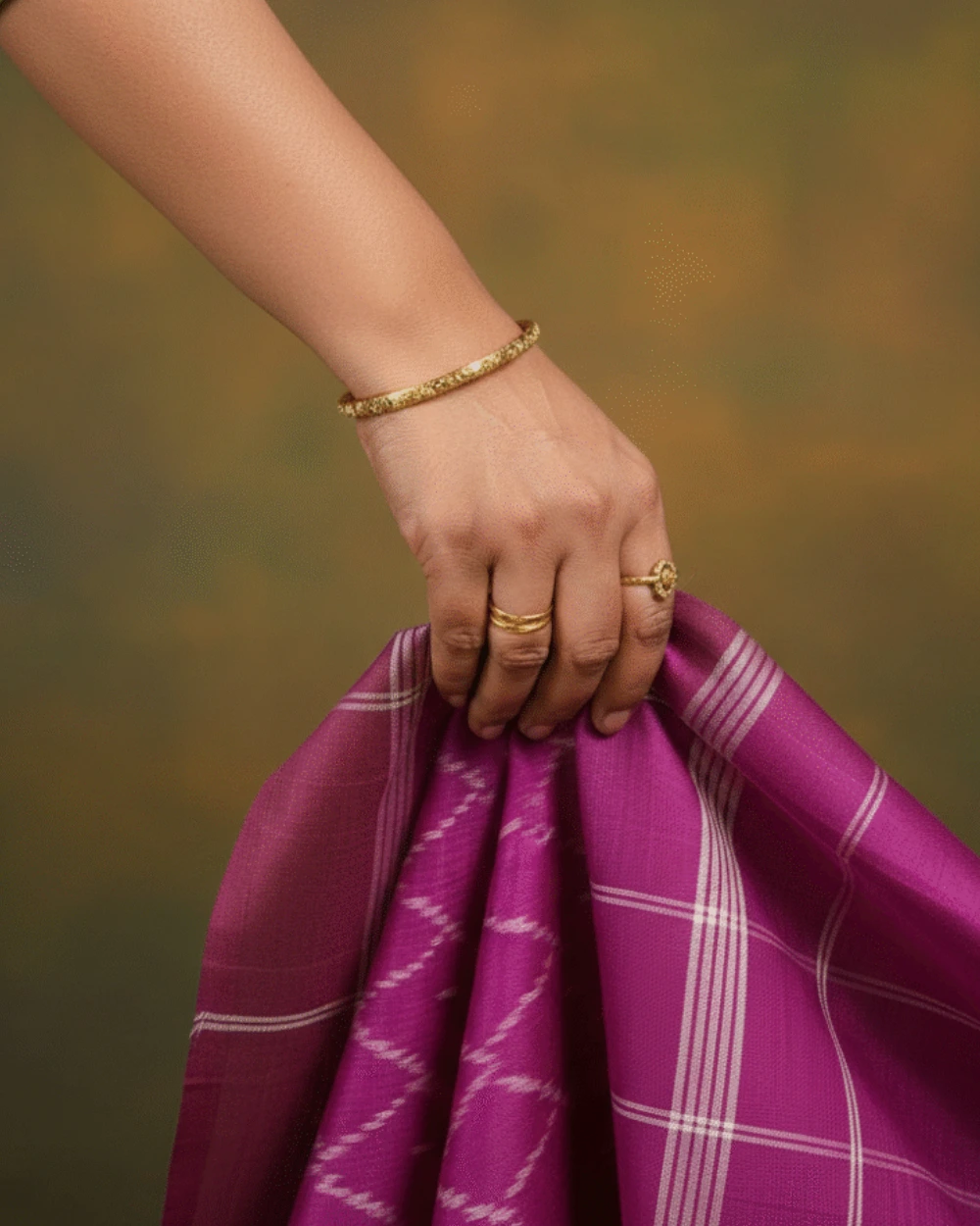 The rich royal purple-colored saree features a detailed, geometric Ikat pattern across the body. Most striking is the end piece, marked by bold, shiny stripes of silver or metallic, which gives the whole saree a very traditional and luxurious look.