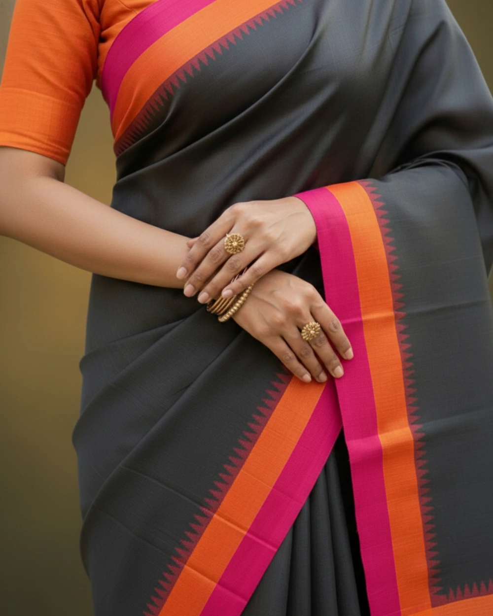 The base of the saree is black, with a bright orange and pink border, and a rich pink pallu that gives it an elegant look. It comes with a matching black blouse piece to give a complete and graceful look.