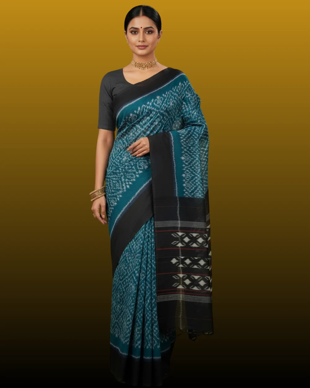 This is a handloom saree in rich teal and turquoise with a delicate Ikat pattern, featuring a broad, elegant black border. The pallu is black with contrasting white and red geometric Ikat designs, and it is paired with a simple black/charcoal blouse.